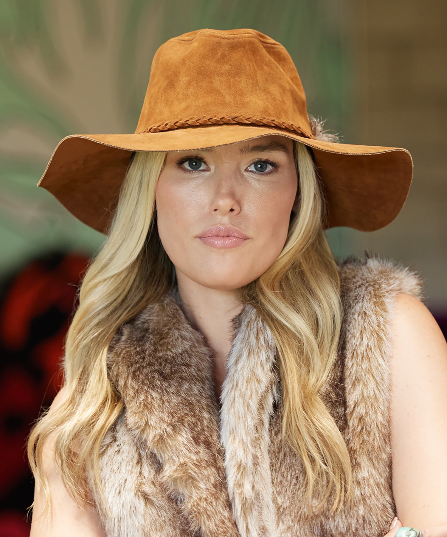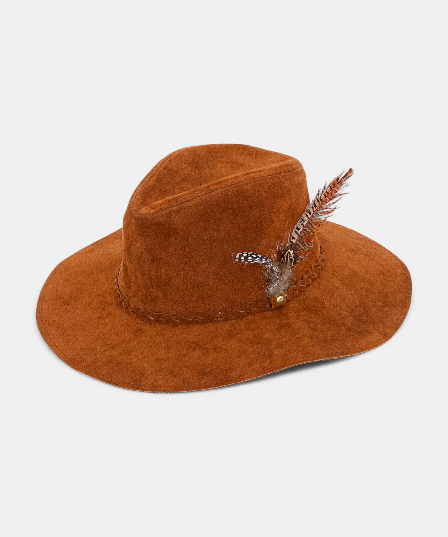 Ultra Felt Suede featuring a braided matching band, feather and Peter Grimm pin. 3.75 inch soft brim.