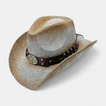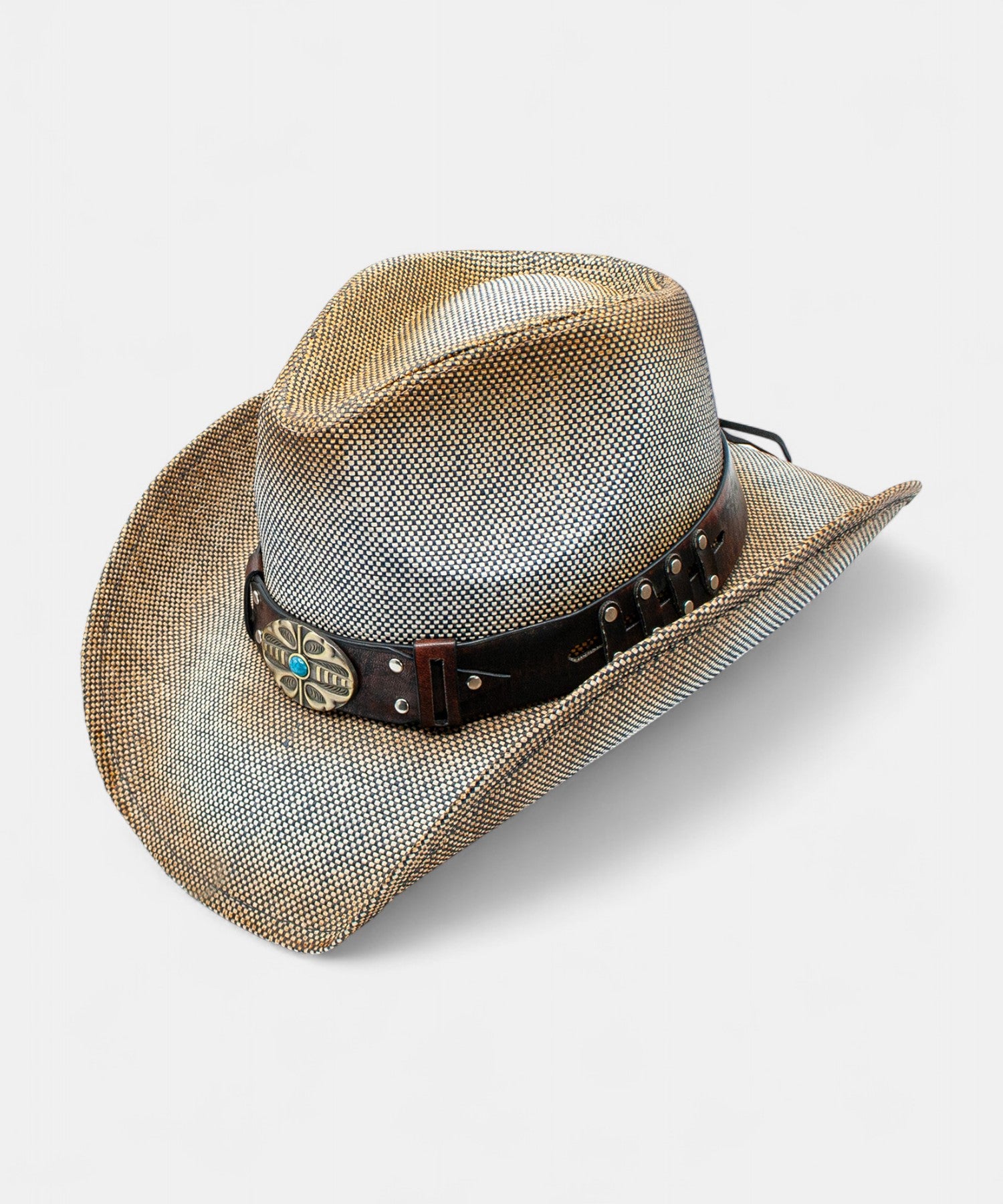 With edgy style this two-tone earthy brown hat is destined for cool festivals and moody nightclubs. A turquoise gem punches the faux leather band with rustic metal trim for the right touch of flair. And, the curled brim gives it a fun, rock and roll vibe. Fashionable for men or women, this hat lets you strut your stuff in style. With its cool distressed design and aged aesthetic, it's bound to turn heads day and night.